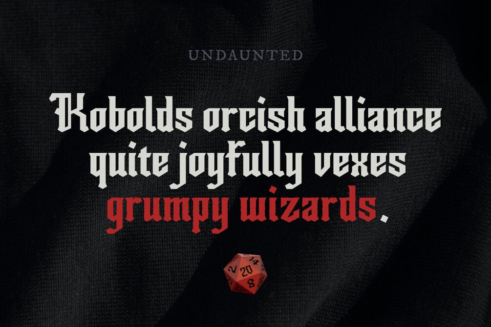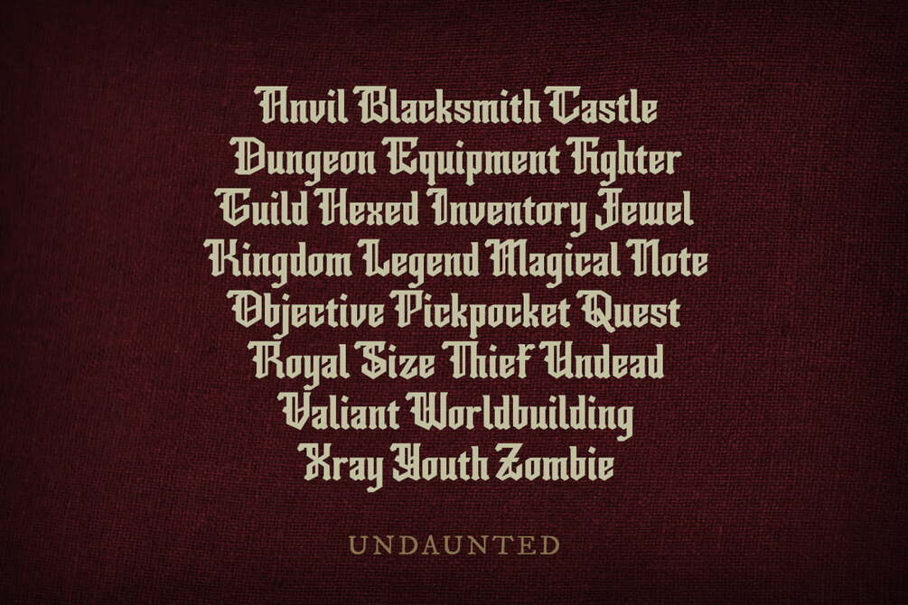 Undaunted is a blackletter font with angular characteristics and iconic, flat-topped glyphs! This rugged font comes in 5 styles and is the perfect match for no-nonsense logos, headings, merchandise, and show-stopping TTRPGs!