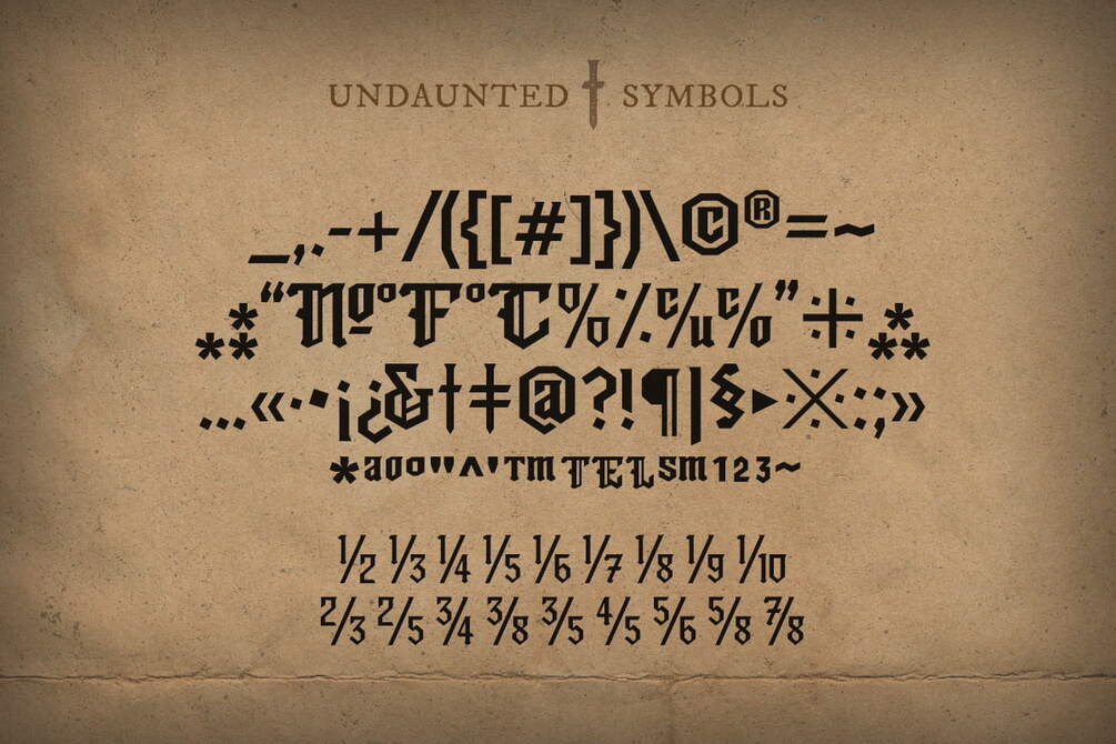 You'll get: Undaunted blackletter font package containing 5 styles: regular, rough, bleed, stamp, and outline. You will also get a copy of your font license. (Please note that the demo version only contains the regular style with limited glyphs)